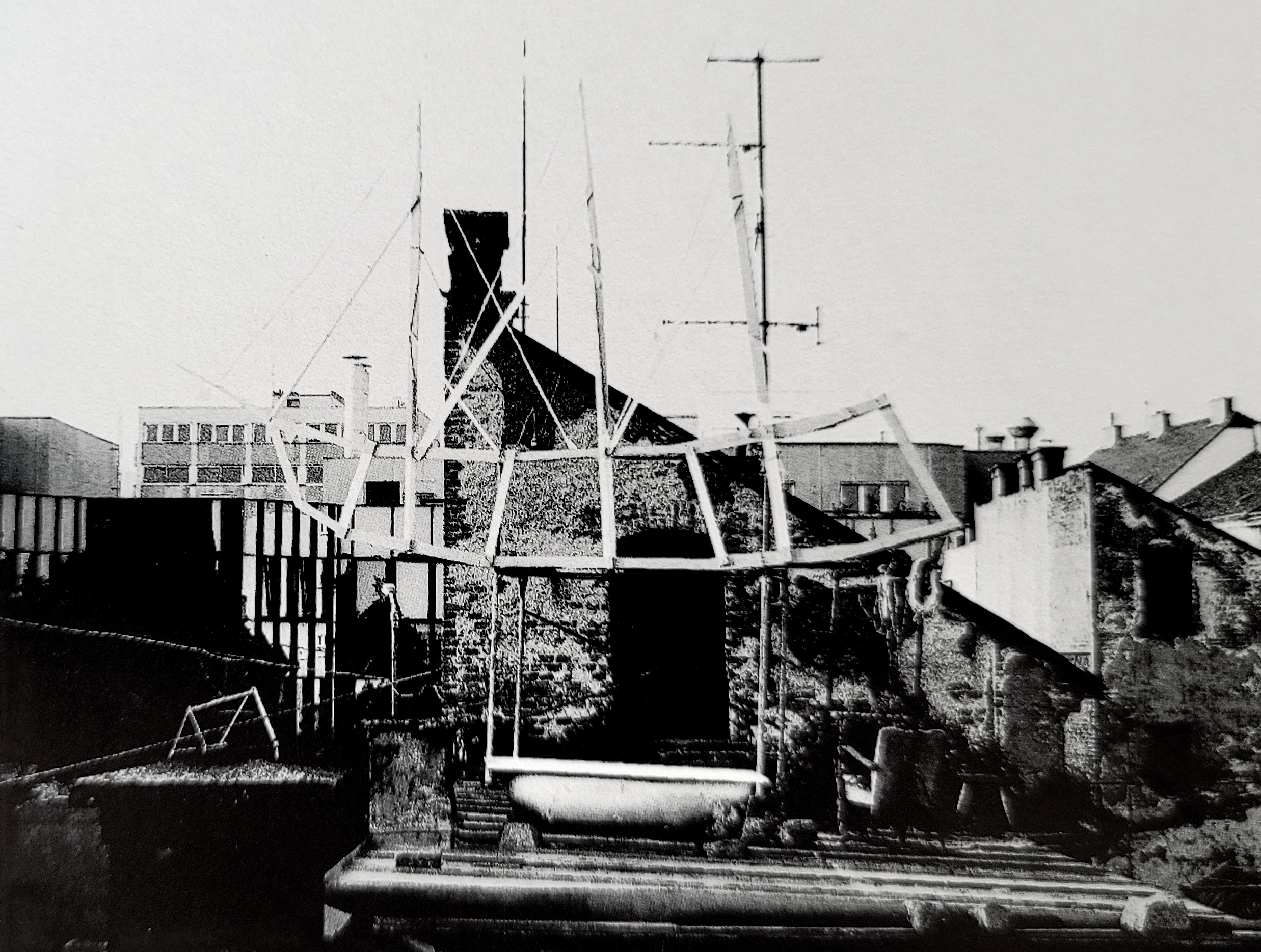 + Bildelement 1: Schiff am First des alten STWST-Hauses aus Holzlatten, Teil der Installation „Schneckenreich“ von Leo Schatzl, im Rahmen von „Singing Pool“ zur Ars Electronica 1984.