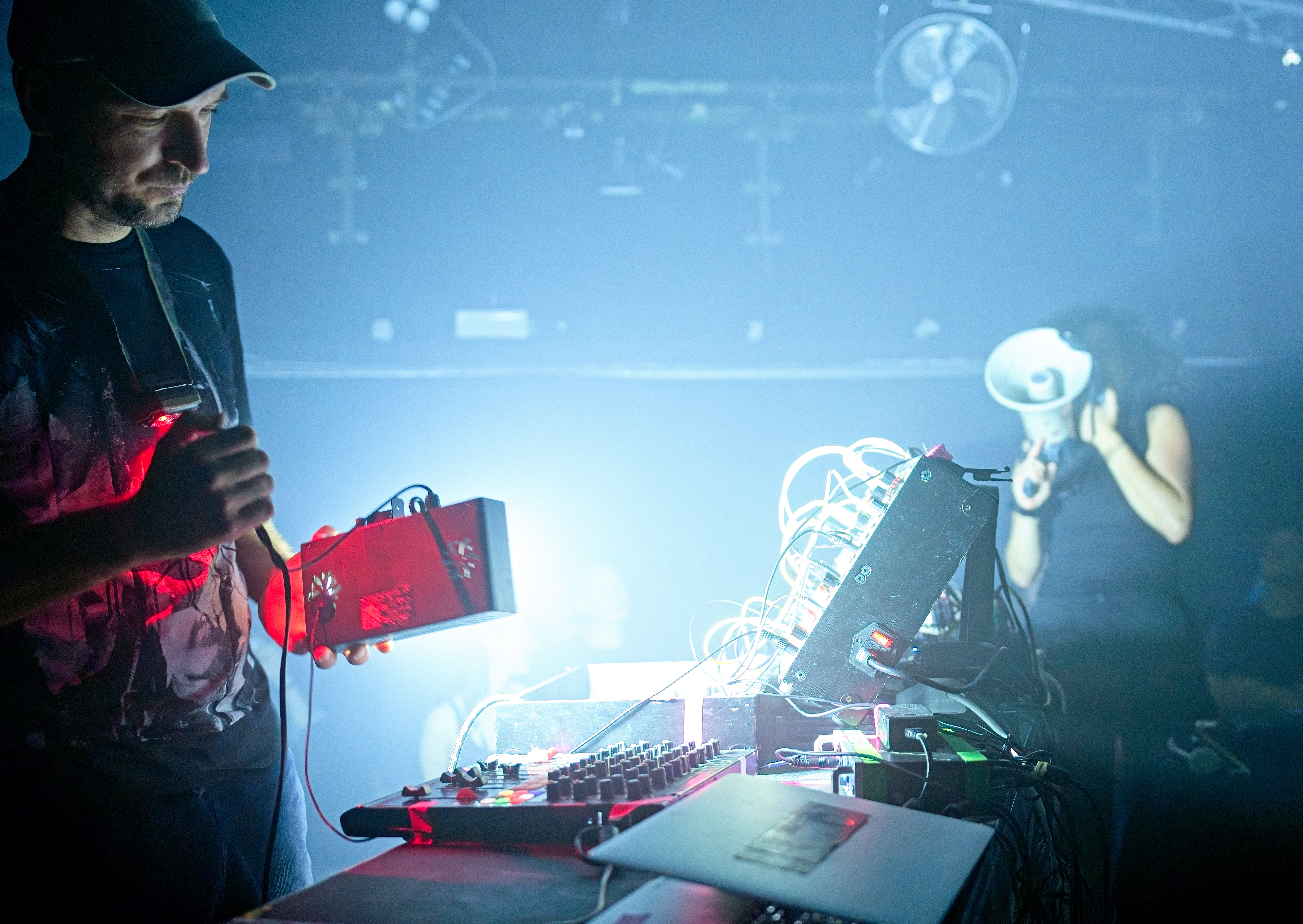 PLF neigt dazu, ihre individuellen Sounds an eine Grenze zu bringen, an der sie an Schreie grenzen: ein unmittelbarer, ungefilterter Klangausdruck, der nicht durch Logik, Sprache oder konventionelle harmonische Strukturen vermittelt wird. Mit Kutin, der auf selbstgebauten Licht-Feedback-Maschinen spielt, die eine Reihe von Synthesizern antreiben, König, der mit seinem perkussiv-elektronischen Handwerk intensive rhythmische Muster webt, und Brandhis wilden, viszeralen Vokalisationen, die alles durchdringen, produziert PLF harte Musik, die so roh wie rein ist – direkt in ihren Gesten und kompromisslos in ihrer Energie. In einer Zeit, die von Fragmentierung geprägt ist – zwischen Auftritten, familiären Verpflichtungen, digitalem Leben und ständiger Reisetätigkeit – navigiert PLF durch die Realitäten einer sich wandelnden Kulturwirtschaft und nimmt Instabilität als Teil ihrer künstlerischen Identität an.